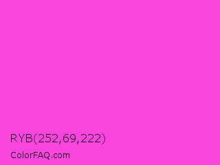 RYB 252,69,222 Color is a light magenta color and the nearest color is Purple Pizzazz #fe4eda. Hex code #fc45de and RGB value is rgb(252,69,222). In RGB color space, this color is composed of 99% red, 27% green, 87% blue, In CMYK color space, this color is composed of 0% cyan, 73% magenta, 12% yellow , 1% black , In HSL color space, this color has a hue angle of 310° , 97% saturation and 63% lightness.