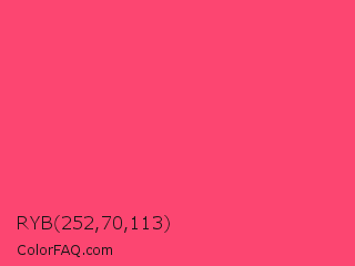 RYB 252,70,113 Color is a light red color and the nearest color is Infra Red #ff496c. Hex code #fc4671 and RGB value is rgb(252,70,113). In RGB color space, this color is composed of 99% red, 27% green, 44% blue, In CMYK color space, this color is composed of 0% cyan, 72% magenta, 55% yellow , 1% black , In HSL color space, this color has a hue angle of 346° , 97% saturation and 63% lightness.