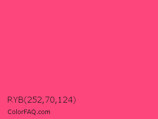 RYB 252,70,124 Color is a light rose color and the nearest color is Sasquatch Socks #ff4681. Hex code #fc467c and RGB value is rgb(252,70,124). In RGB color space, this color is composed of 99% red, 27% green, 49% blue, In CMYK color space, this color is composed of 0% cyan, 72% magenta, 51% yellow , 1% black , In HSL color space, this color has a hue angle of 342° , 97% saturation and 63% lightness.