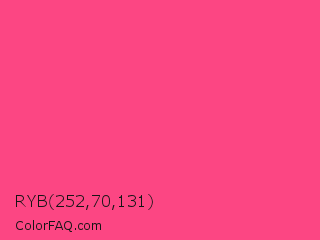 RYB 252,70,131 Color is a light rose color and the nearest color is Sasquatch Socks #ff4681. Hex code #fc4683 and RGB value is rgb(252,70,131). In RGB color space, this color is composed of 99% red, 27% green, 51% blue, In CMYK color space, this color is composed of 0% cyan, 72% magenta, 48% yellow , 1% black , In HSL color space, this color has a hue angle of 340° , 97% saturation and 63% lightness.