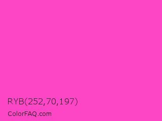 RYB 252,70,197 Color is a light magenta color and the nearest color is Razzle Dazzle Rose #ff33cc. Hex code #fc46c5 and RGB value is rgb(252,70,197). In RGB color space, this color is composed of 99% red, 27% green, 77% blue, In CMYK color space, this color is composed of 0% cyan, 72% magenta, 22% yellow , 1% black , In HSL color space, this color has a hue angle of 318° , 97% saturation and 63% lightness.