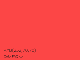 RYB 252,70,70 Color is a light red color and the nearest color is Tart Orange #fb4d46. Hex code #fc4646 and RGB value is rgb(252,70,70). In RGB color space, this color is composed of 99% red, 27% green, 27% blue, In CMYK color space, this color is composed of 0% cyan, 72% magenta, 72% yellow , 1% black , In HSL color space, this color has a hue angle of 0° , 97% saturation and 63% lightness.