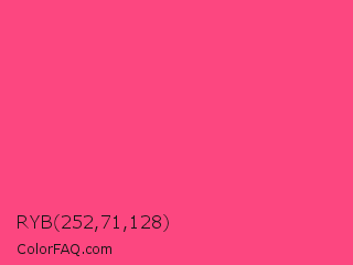RYB 252,71,128 Color is a light rose color and the nearest color is Sasquatch Socks #ff4681. Hex code #fc4780 and RGB value is rgb(252,71,128). In RGB color space, this color is composed of 99% red, 28% green, 50% blue, In CMYK color space, this color is composed of 0% cyan, 72% magenta, 49% yellow , 1% black , In HSL color space, this color has a hue angle of 341° , 97% saturation and 63% lightness.