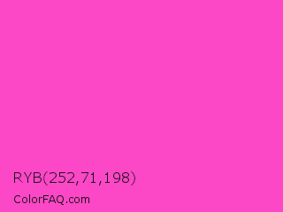 RYB 252,71,198 Color is a light magenta color and the nearest color is Razzle Dazzle Rose #ff33cc. Hex code #fc47c6 and RGB value is rgb(252,71,198). In RGB color space, this color is composed of 99% red, 28% green, 78% blue, In CMYK color space, this color is composed of 0% cyan, 72% magenta, 21% yellow , 1% black , In HSL color space, this color has a hue angle of 318° , 97% saturation and 63% lightness.