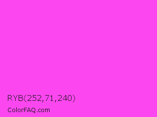 RYB 252,71,240 Color is a light magenta color and the nearest color is Purple Pizzazz #fe4eda. Hex code #fc47f0 and RGB value is rgb(252,71,240). In RGB color space, this color is composed of 99% red, 28% green, 94% blue, In CMYK color space, this color is composed of 0% cyan, 72% magenta, 5% yellow , 1% black , In HSL color space, this color has a hue angle of 304° , 97% saturation and 63% lightness.