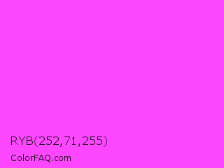 RYB 252,71,255 Color is a light magenta color and the nearest color is Pink Flamingo Crayola #ff66ff. Hex code #fc47ff and RGB value is rgb(252,71,255). In RGB color space, this color is composed of 99% red, 28% green, 100% blue, In CMYK color space, this color is composed of 1% cyan, 72% magenta, 0% yellow , 0% black , In HSL color space, this color has a hue angle of 299° , 100% saturation and 64% lightness.