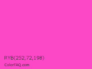 RYB 252,72,198 Color is a light magenta color and the nearest color is Purple Pizzazz #fe4eda. Hex code #fc48c6 and RGB value is rgb(252,72,198). In RGB color space, this color is composed of 99% red, 28% green, 78% blue, In CMYK color space, this color is composed of 0% cyan, 71% magenta, 21% yellow , 1% black , In HSL color space, this color has a hue angle of 318° , 97% saturation and 64% lightness.