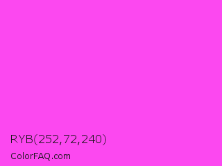 RYB 252,72,240 Color is a light magenta color and the nearest color is Purple Pizzazz #fe4eda. Hex code #fc48f0 and RGB value is rgb(252,72,240). In RGB color space, this color is composed of 99% red, 28% green, 94% blue, In CMYK color space, this color is composed of 0% cyan, 71% magenta, 5% yellow , 1% black , In HSL color space, this color has a hue angle of 304° , 97% saturation and 64% lightness.
