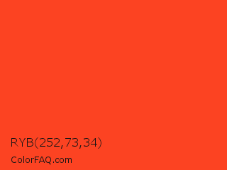 RYB 252,73,34 Color is a normal red color and the nearest color is Pomegranate #f34723. Hex code #fc4322 and RGB value is rgb(252,67,34). In RGB color space, this color is composed of 99% red, 26% green, 13% blue, In CMYK color space, this color is composed of 0% cyan, 73% magenta, 87% yellow , 1% black , In HSL color space, this color has a hue angle of 9° , 97% saturation and 56% lightness.