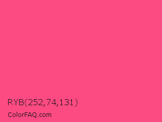 RYB 252,74,131 Color is a light rose color and the nearest color is Sasquatch Socks #ff4681. Hex code #fc4a83 and RGB value is rgb(252,74,131). In RGB color space, this color is composed of 99% red, 29% green, 51% blue, In CMYK color space, this color is composed of 0% cyan, 71% magenta, 48% yellow , 1% black , In HSL color space, this color has a hue angle of 341° , 97% saturation and 64% lightness.