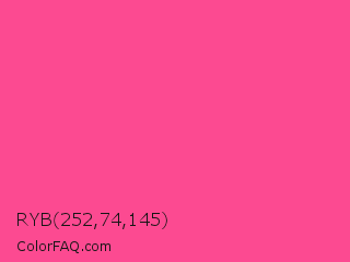 RYB 252,74,145 Color is a light rose color and the nearest color is French Rose #f64a8a. Hex code #fc4a91 and RGB value is rgb(252,74,145). In RGB color space, this color is composed of 99% red, 29% green, 57% blue, In CMYK color space, this color is composed of 0% cyan, 71% magenta, 42% yellow , 1% black , In HSL color space, this color has a hue angle of 336° , 97% saturation and 64% lightness.