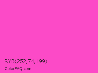 RYB 252,74,199 Color is a light magenta color and the nearest color is Light Deep Pink #ff5ccd. Hex code #fc4ac7 and RGB value is rgb(252,74,199). In RGB color space, this color is composed of 99% red, 29% green, 78% blue, In CMYK color space, this color is composed of 0% cyan, 71% magenta, 21% yellow , 1% black , In HSL color space, this color has a hue angle of 318° , 97% saturation and 64% lightness.