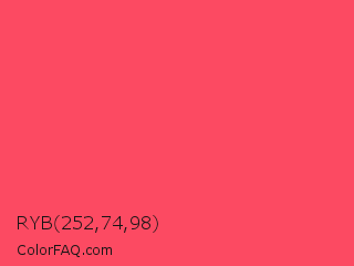 RYB 252,74,98 Color is a light red color and the nearest color is Magic Potion #ff4466. Hex code #fc4a62 and RGB value is rgb(252,74,98). In RGB color space, this color is composed of 99% red, 29% green, 38% blue, In CMYK color space, this color is composed of 0% cyan, 71% magenta, 61% yellow , 1% black , In HSL color space, this color has a hue angle of 352° , 97% saturation and 64% lightness.