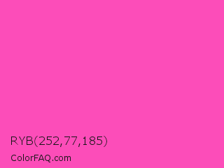 RYB 252,77,185 Color is a light magenta color and the nearest color is Brilliant Rose #f653a6. Hex code #fc4db9 and RGB value is rgb(252,77,185). In RGB color space, this color is composed of 99% red, 30% green, 73% blue, In CMYK color space, this color is composed of 0% cyan, 69% magenta, 27% yellow , 1% black , In HSL color space, this color has a hue angle of 323° , 97% saturation and 65% lightness.