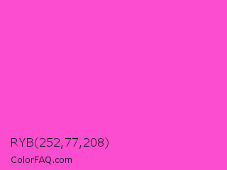 RYB 252,77,208 Color is a light magenta color and the nearest color is Purple Pizzazz #fe4eda. Hex code #fc4dd0 and RGB value is rgb(252,77,208). In RGB color space, this color is composed of 99% red, 30% green, 82% blue, In CMYK color space, this color is composed of 0% cyan, 69% magenta, 17% yellow , 1% black , In HSL color space, this color has a hue angle of 315° , 97% saturation and 65% lightness.