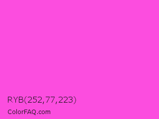RYB 252,77,223 Color is a light magenta color and the nearest color is Purple Pizzazz #fe4eda. Hex code #fc4ddf and RGB value is rgb(252,77,223). In RGB color space, this color is composed of 99% red, 30% green, 87% blue, In CMYK color space, this color is composed of 0% cyan, 69% magenta, 12% yellow , 1% black , In HSL color space, this color has a hue angle of 310° , 97% saturation and 65% lightness.