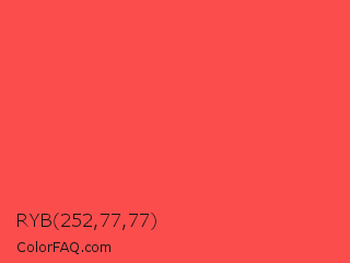 RYB 252,77,77 Color is a light red color and the nearest color is Tart Orange #fb4d46. Hex code #fc4d4d and RGB value is rgb(252,77,77). In RGB color space, this color is composed of 99% red, 30% green, 30% blue, In CMYK color space, this color is composed of 0% cyan, 69% magenta, 69% yellow , 1% black , In HSL color space, this color has a hue angle of 0° , 97% saturation and 65% lightness.