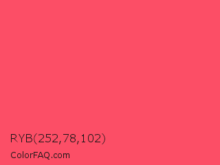 RYB 252,78,102 Color is a light red color and the nearest color is Infra Red #ff496c. Hex code #fc4e66 and RGB value is rgb(252,78,102). In RGB color space, this color is composed of 99% red, 31% green, 40% blue, In CMYK color space, this color is composed of 0% cyan, 69% magenta, 60% yellow , 1% black , In HSL color space, this color has a hue angle of 352° , 97% saturation and 65% lightness.