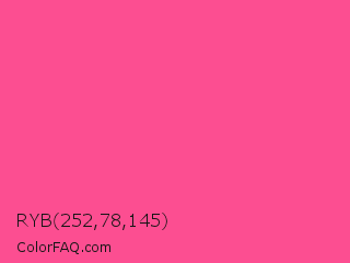 RYB 252,78,145 Color is a light rose color and the nearest color is Violet Red #f75394. Hex code #fc4e91 and RGB value is rgb(252,78,145). In RGB color space, this color is composed of 99% red, 31% green, 57% blue, In CMYK color space, this color is composed of 0% cyan, 69% magenta, 42% yellow , 1% black , In HSL color space, this color has a hue angle of 337° , 97% saturation and 65% lightness.