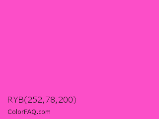 RYB 252,78,200 Color is a light magenta color and the nearest color is Light Deep Pink #ff5ccd. Hex code #fc4ec8 and RGB value is rgb(252,78,200). In RGB color space, this color is composed of 99% red, 31% green, 78% blue, In CMYK color space, this color is composed of 0% cyan, 69% magenta, 21% yellow , 1% black , In HSL color space, this color has a hue angle of 318° , 97% saturation and 65% lightness.