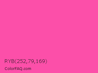 RYB 252,79,169 Color is a light rose color and the nearest color is Brilliant Rose #f653a6. Hex code #fc4fa9 and RGB value is rgb(252,79,169). In RGB color space, this color is composed of 99% red, 31% green, 66% blue, In CMYK color space, this color is composed of 0% cyan, 69% magenta, 33% yellow , 1% black , In HSL color space, this color has a hue angle of 329° , 97% saturation and 65% lightness.