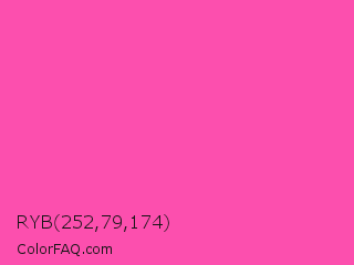 RYB 252,79,174 Color is a light magenta color and the nearest color is Brilliant Rose #f653a6. Hex code #fc4fae and RGB value is rgb(252,79,174). In RGB color space, this color is composed of 99% red, 31% green, 68% blue, In CMYK color space, this color is composed of 0% cyan, 69% magenta, 31% yellow , 1% black , In HSL color space, this color has a hue angle of 327° , 97% saturation and 65% lightness.