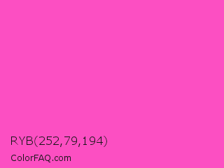 RYB 252,79,194 Color is a light magenta color and the nearest color is Light Deep Pink #ff5ccd. Hex code #fc4fc2 and RGB value is rgb(252,79,194). In RGB color space, this color is composed of 99% red, 31% green, 76% blue, In CMYK color space, this color is composed of 0% cyan, 69% magenta, 23% yellow , 1% black , In HSL color space, this color has a hue angle of 320° , 97% saturation and 65% lightness.
