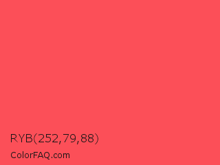 RYB 252,79,88 Color is a light red color and the nearest color is Carnation #f95a61. Hex code #fc4f58 and RGB value is rgb(252,79,88). In RGB color space, this color is composed of 99% red, 31% green, 35% blue, In CMYK color space, this color is composed of 0% cyan, 69% magenta, 65% yellow , 1% black , In HSL color space, this color has a hue angle of 357° , 97% saturation and 65% lightness.