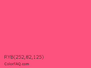 RYB 252,82,125 Color is a light red color and the nearest color is Wild Watermelon #fd5b78. Hex code #fc527d and RGB value is rgb(252,82,125). In RGB color space, this color is composed of 99% red, 32% green, 49% blue, In CMYK color space, this color is composed of 0% cyan, 67% magenta, 50% yellow , 1% black , In HSL color space, this color has a hue angle of 345° , 97% saturation and 65% lightness.