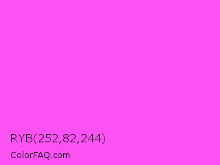 RYB 252,82,244 Color is a light magenta color and the nearest color is Pink Flamingo Crayola #ff66ff. Hex code #fc52f4 and RGB value is rgb(252,82,244). In RGB color space, this color is composed of 99% red, 32% green, 96% blue, In CMYK color space, this color is composed of 0% cyan, 67% magenta, 3% yellow , 1% black , In HSL color space, this color has a hue angle of 303° , 97% saturation and 65% lightness.