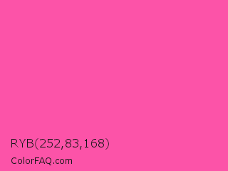 RYB 252,83,168 Color is a light rose color and the nearest color is Brilliant Rose #ff55a3. Hex code #fc53a8 and RGB value is rgb(252,83,168). In RGB color space, this color is composed of 99% red, 33% green, 66% blue, In CMYK color space, this color is composed of 0% cyan, 67% magenta, 33% yellow , 1% black , In HSL color space, this color has a hue angle of 330° , 97% saturation and 66% lightness.