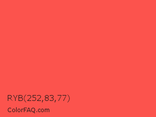 RYB 252,83,77 Color is a light red color and the nearest color is Red Orange #ff5349. Hex code #fc534d and RGB value is rgb(252,83,77). In RGB color space, this color is composed of 99% red, 33% green, 30% blue, In CMYK color space, this color is composed of 0% cyan, 67% magenta, 69% yellow , 1% black , In HSL color space, this color has a hue angle of 2° , 97% saturation and 65% lightness.