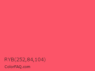 RYB 252,84,104 Color is a light red color and the nearest color is Fiery Rose #ff5470. Hex code #fc5468 and RGB value is rgb(252,84,104). In RGB color space, this color is composed of 99% red, 33% green, 41% blue, In CMYK color space, this color is composed of 0% cyan, 67% magenta, 59% yellow , 1% black , In HSL color space, this color has a hue angle of 353° , 97% saturation and 66% lightness.