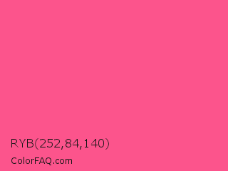 RYB 252,84,140 Color is a light rose color and the nearest color is Strawberry #fc5a8d. Hex code #fc548c and RGB value is rgb(252,84,140). In RGB color space, this color is composed of 99% red, 33% green, 55% blue, In CMYK color space, this color is composed of 0% cyan, 67% magenta, 44% yellow , 1% black , In HSL color space, this color has a hue angle of 340° , 97% saturation and 66% lightness.