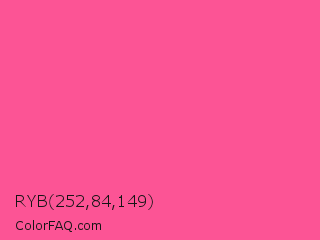 RYB 252,84,149 Color is a light rose color and the nearest color is Violet Red #f75394. Hex code #fc5495 and RGB value is rgb(252,84,149). In RGB color space, this color is composed of 99% red, 33% green, 58% blue, In CMYK color space, this color is composed of 0% cyan, 67% magenta, 41% yellow , 1% black , In HSL color space, this color has a hue angle of 337° , 97% saturation and 66% lightness.