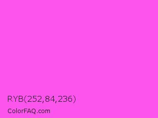 RYB 252,84,236 Color is a light magenta color and the nearest color is Purple Pizzazz #fe4eda. Hex code #fc54ec and RGB value is rgb(252,84,236). In RGB color space, this color is composed of 99% red, 33% green, 93% blue, In CMYK color space, this color is composed of 0% cyan, 67% magenta, 6% yellow , 1% black , In HSL color space, this color has a hue angle of 306° , 97% saturation and 66% lightness.