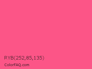 RYB 252,85,135 Color is a light rose color and the nearest color is Strawberry #fc5a8d. Hex code #fc5587 and RGB value is rgb(252,85,135). In RGB color space, this color is composed of 99% red, 33% green, 53% blue, In CMYK color space, this color is composed of 0% cyan, 66% magenta, 46% yellow , 1% black , In HSL color space, this color has a hue angle of 342° , 97% saturation and 66% lightness.