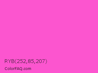 RYB 252,85,207 Color is a light magenta color and the nearest color is Light Deep Pink #ff5ccd. Hex code #fc55cf and RGB value is rgb(252,85,207). In RGB color space, this color is composed of 99% red, 33% green, 81% blue, In CMYK color space, this color is composed of 0% cyan, 66% magenta, 18% yellow , 1% black , In HSL color space, this color has a hue angle of 316° , 97% saturation and 66% lightness.