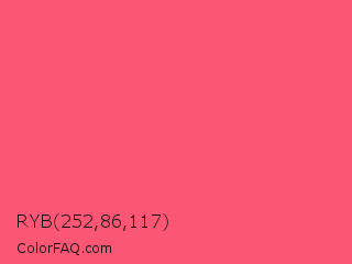 RYB 252,86,117 Color is a light red color and the nearest color is Wild Watermelon #fd5b78. Hex code #fc5675 and RGB value is rgb(252,86,117). In RGB color space, this color is composed of 99% red, 34% green, 46% blue, In CMYK color space, this color is composed of 0% cyan, 66% magenta, 54% yellow , 1% black , In HSL color space, this color has a hue angle of 349° , 97% saturation and 66% lightness.