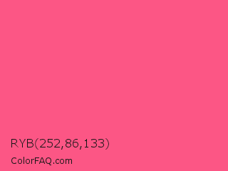 RYB 252,86,133 Color is a light rose color and the nearest color is Strawberry #fc5a8d. Hex code #fc5685 and RGB value is rgb(252,86,133). In RGB color space, this color is composed of 99% red, 34% green, 52% blue, In CMYK color space, this color is composed of 0% cyan, 66% magenta, 47% yellow , 1% black , In HSL color space, this color has a hue angle of 343° , 97% saturation and 66% lightness.