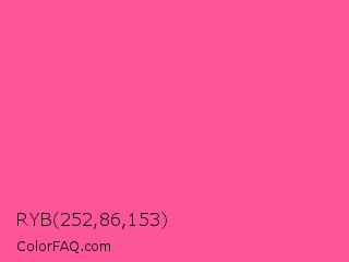 RYB 252,86,153 Color is a light rose color and the nearest color is Violet Red #f75394. Hex code #fc5699 and RGB value is rgb(252,86,153). In RGB color space, this color is composed of 99% red, 34% green, 60% blue, In CMYK color space, this color is composed of 0% cyan, 66% magenta, 39% yellow , 1% black , In HSL color space, this color has a hue angle of 336° , 97% saturation and 66% lightness.