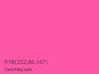 RYB 252,86,167 Color is a light rose color and the nearest color is Brilliant Rose #ff55a3. Hex code #fc56a7 and RGB value is rgb(252,86,167). In RGB color space, this color is composed of 99% red, 34% green, 65% blue, In CMYK color space, this color is composed of 0% cyan, 66% magenta, 34% yellow , 1% black , In HSL color space, this color has a hue angle of 331° , 97% saturation and 66% lightness.