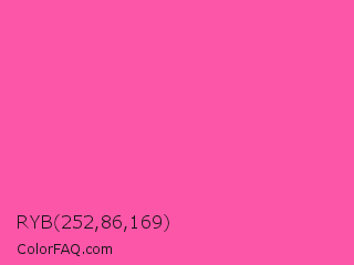 RYB 252,86,169 Color is a light rose color and the nearest color is Brilliant Rose #ff55a3. Hex code #fc56a9 and RGB value is rgb(252,86,169). In RGB color space, this color is composed of 99% red, 34% green, 66% blue, In CMYK color space, this color is composed of 0% cyan, 66% magenta, 33% yellow , 1% black , In HSL color space, this color has a hue angle of 330° , 97% saturation and 66% lightness.