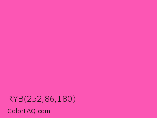 RYB 252,86,180 Color is a light magenta color and the nearest color is Brilliant Rose #f653a6. Hex code #fc56b4 and RGB value is rgb(252,86,180). In RGB color space, this color is composed of 99% red, 34% green, 71% blue, In CMYK color space, this color is composed of 0% cyan, 66% magenta, 29% yellow , 1% black , In HSL color space, this color has a hue angle of 326° , 97% saturation and 66% lightness.