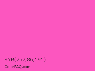 RYB 252,86,191 Color is a light magenta color and the nearest color is Light Deep Pink #ff5ccd. Hex code #fc56bf and RGB value is rgb(252,86,191). In RGB color space, this color is composed of 99% red, 34% green, 75% blue, In CMYK color space, this color is composed of 0% cyan, 66% magenta, 24% yellow , 1% black , In HSL color space, this color has a hue angle of 322° , 97% saturation and 66% lightness.