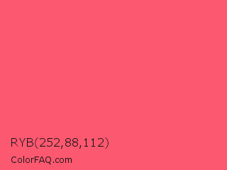 RYB 252,88,112 Color is a light red color and the nearest color is Fiery Rose #ff5470. Hex code #fc5870 and RGB value is rgb(252,88,112). In RGB color space, this color is composed of 99% red, 35% green, 44% blue, In CMYK color space, this color is composed of 0% cyan, 65% magenta, 56% yellow , 1% black , In HSL color space, this color has a hue angle of 351° , 96% saturation and 67% lightness.