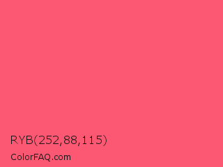 RYB 252,88,115 Color is a light red color and the nearest color is Fiery Rose #ff5470. Hex code #fc5873 and RGB value is rgb(252,88,115). In RGB color space, this color is composed of 99% red, 35% green, 45% blue, In CMYK color space, this color is composed of 0% cyan, 65% magenta, 54% yellow , 1% black , In HSL color space, this color has a hue angle of 350° , 96% saturation and 67% lightness.
