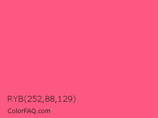 RYB 252,88,129 Color is a light red color and the nearest color is Brink Pink #fb607f. Hex code #fc5881 and RGB value is rgb(252,88,129). In RGB color space, this color is composed of 99% red, 35% green, 51% blue, In CMYK color space, this color is composed of 0% cyan, 65% magenta, 49% yellow , 1% black , In HSL color space, this color has a hue angle of 345° , 96% saturation and 67% lightness.