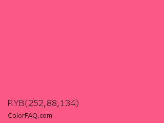 RYB 252,88,134 Color is a light rose color and the nearest color is Strawberry #fc5a8d. Hex code #fc5886 and RGB value is rgb(252,88,134). In RGB color space, this color is composed of 99% red, 35% green, 53% blue, In CMYK color space, this color is composed of 0% cyan, 65% magenta, 47% yellow , 1% black , In HSL color space, this color has a hue angle of 343° , 96% saturation and 67% lightness.