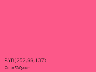 RYB 252,88,137 Color is a light rose color and the nearest color is Strawberry #fc5a8d. Hex code #fc5889 and RGB value is rgb(252,88,137). In RGB color space, this color is composed of 99% red, 35% green, 54% blue, In CMYK color space, this color is composed of 0% cyan, 65% magenta, 46% yellow , 1% black , In HSL color space, this color has a hue angle of 342° , 96% saturation and 67% lightness.